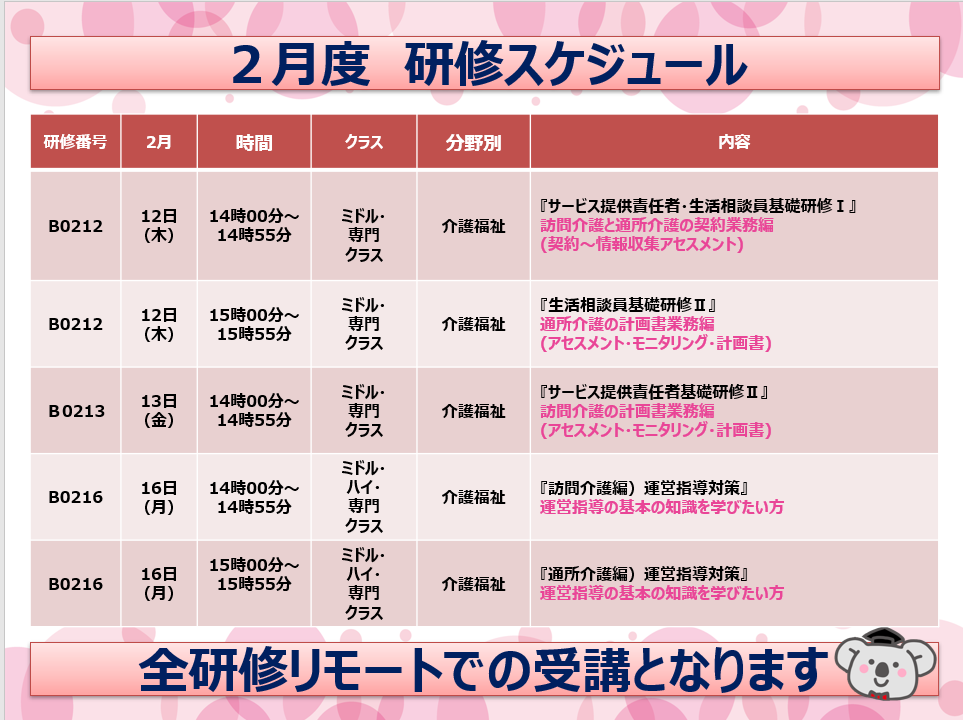 2月度の研修では、介護福祉分野における実務に直結するテーマを中心に、