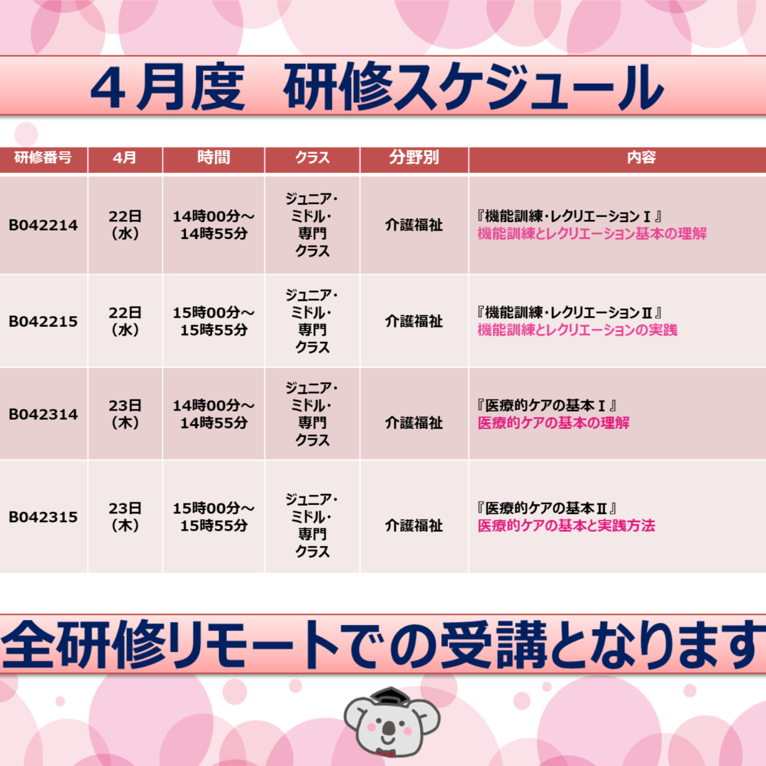 4月の研修スケジュールは、以下をご確認ください。